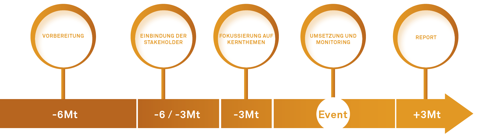 Für eine erfolgreiche Umsetzung ist es wichtig, Personen aus der Organisation, die grossen Einfluss auf das Gelingen oder Scheitern des Vorhabens haben, zu involvieren und zu informieren. Dabei kann ein Kick-off-Meeting helfen. Indem man sie um Anregungen fragt oder was sie zum Prozess beitragen können, wird Bewusstsein für das Vorhaben geschafft. Somit kann man deren Unterstützung sichern. Erfahrungsgemäss ist es nicht immer einfach, eine Veränderung anzustossen, in diesem Fall Nachhaltigkeit ins Eventmanagement zu integrieren. Zu Beginn stösst man womöglich auf Widerstand, denn in erster Linie bedeutet Veränderung mehr Arbeit und mehr Aufwand. Kurzfristig gewiss, aber längerfristig profitieren alle davon. Neben Informieren und Involvieren werden in diesem Meeting die Nachhaltigkeitsziele der Organisation ermittelt sowie Zeitplan und Budget festgelegt.